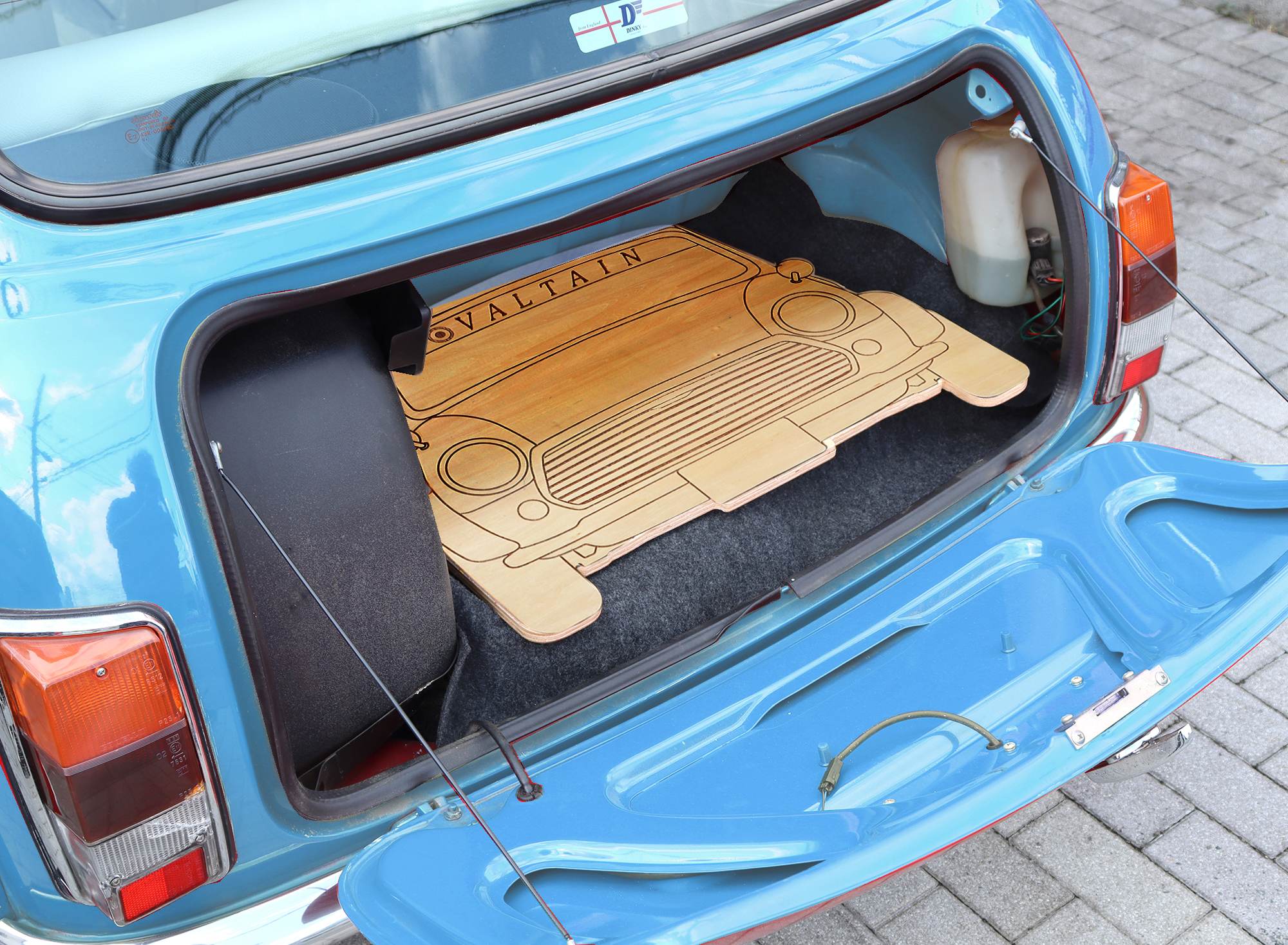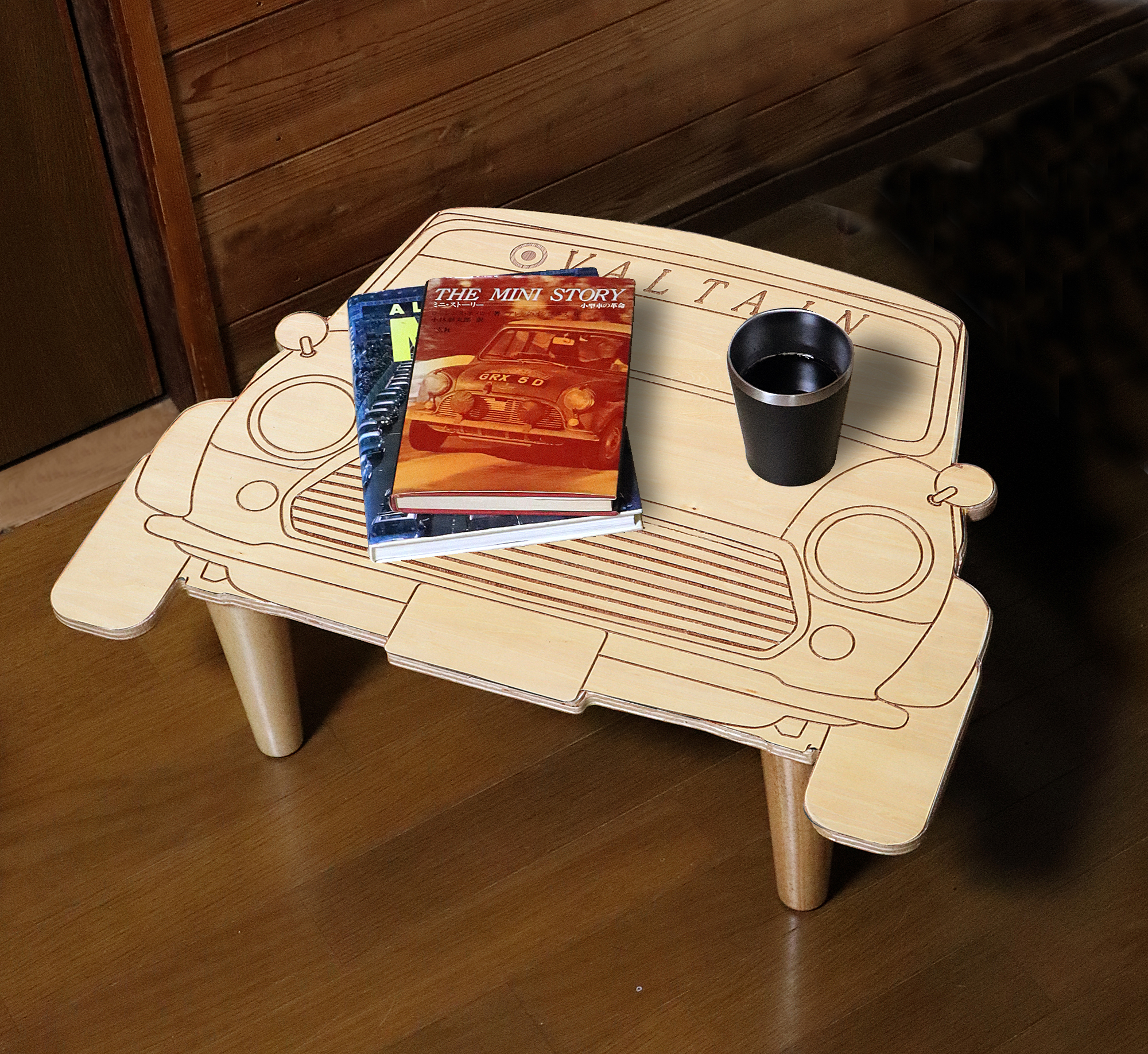 マークIIの顔が彫り込まれた、かわいいトランクテーブル第二弾。トランクテーブルを楽しめるのはミニの特権。足の長さ、トランクへの引っ掛け部分はミニにフィットする専用設計。天板はシングルタンクのトランクルームにピッタリ収まるサイズです。天気のいい日にちょっとそこまで、気軽にミニとお出かけしてランチタイムを楽しみましょう。